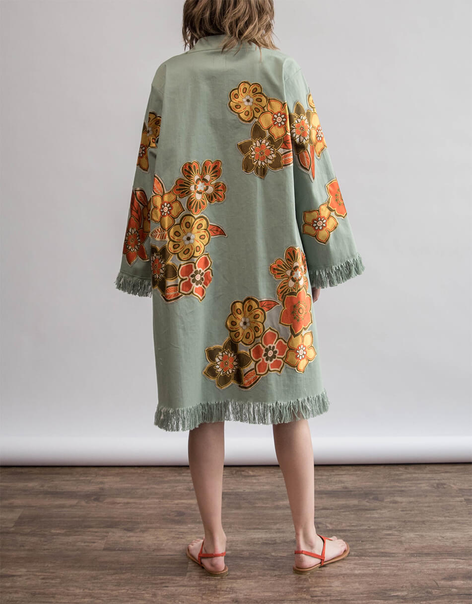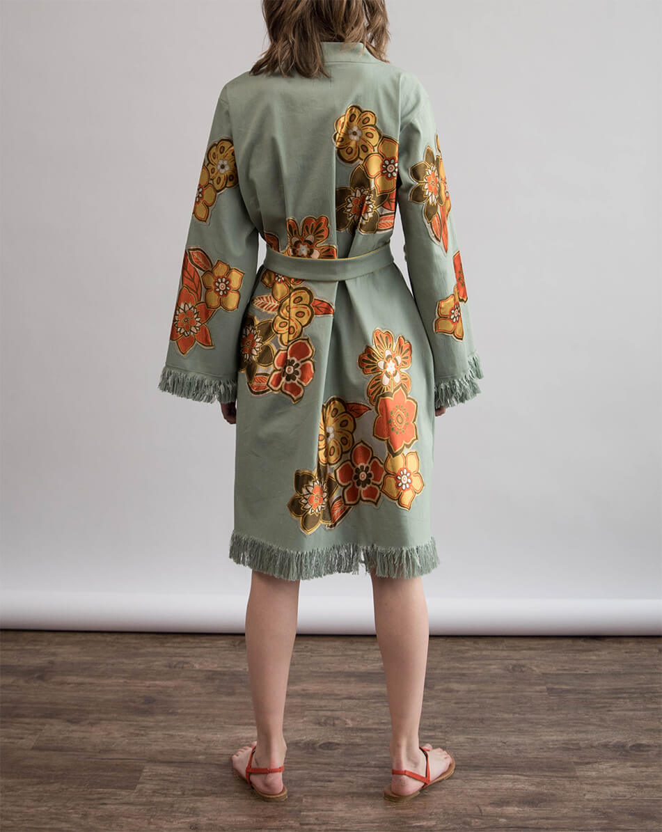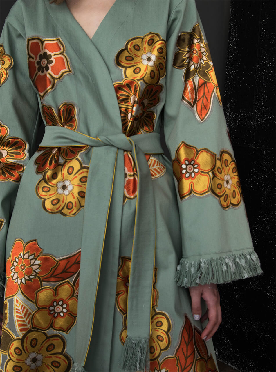 Кімоно з вишитими вручну квітами. Вільного крою з широким рукавом. Кімоно декороване бахромою на рукавах і по лінії низу. Дві кишені в бічних швах. Є пояс із бахромою.