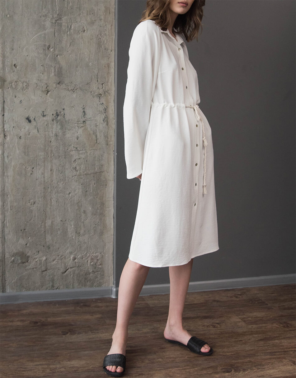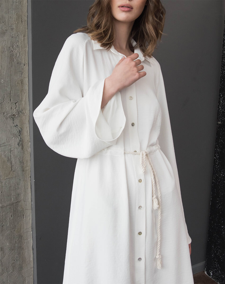 Сукня сорочка під пояс. Прямого силуету з куліскою на талії. Пояс – бавовняний канат. Рукав розширений до низу, довжина повна. Ґудзики виконані з натурального перламутру.
