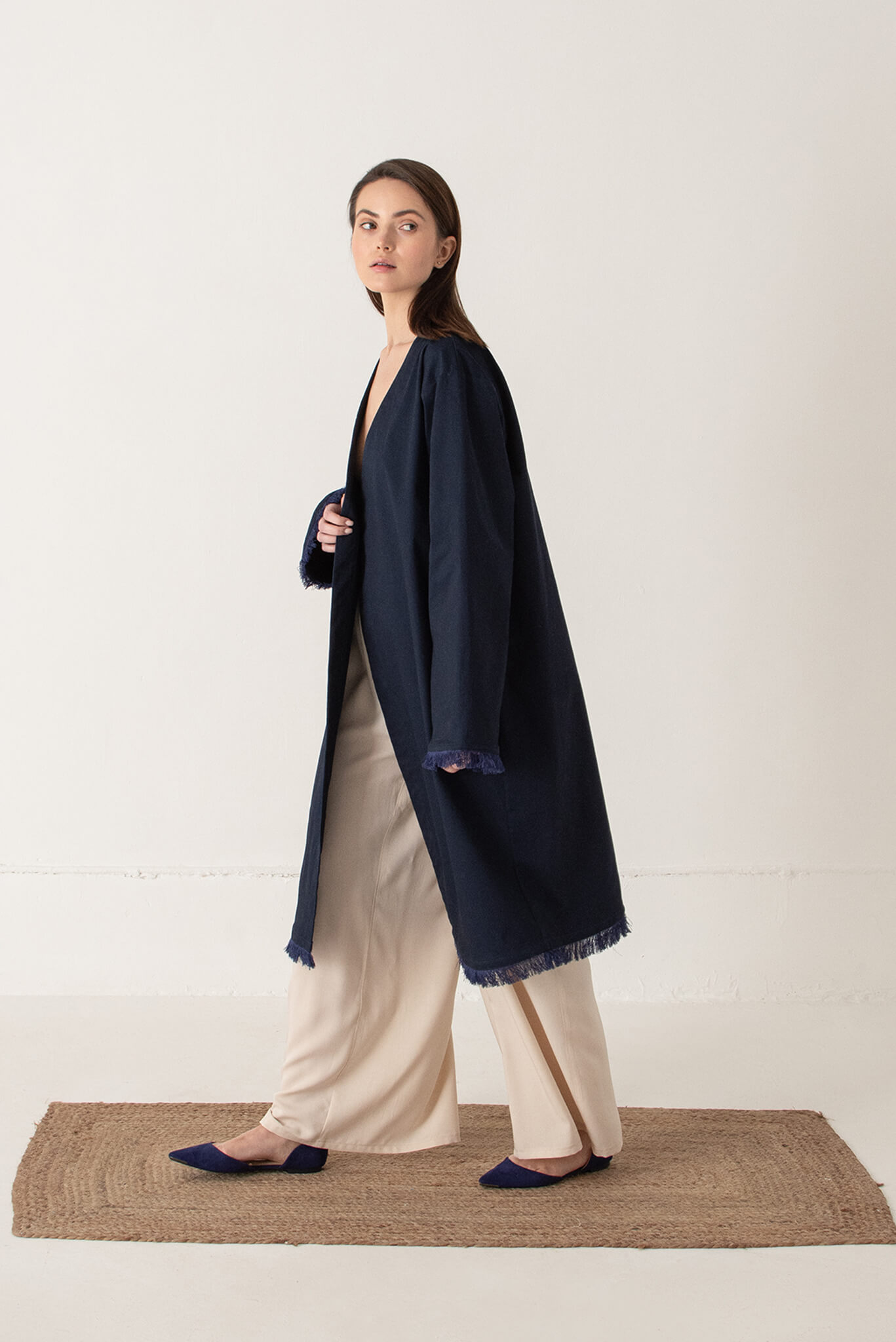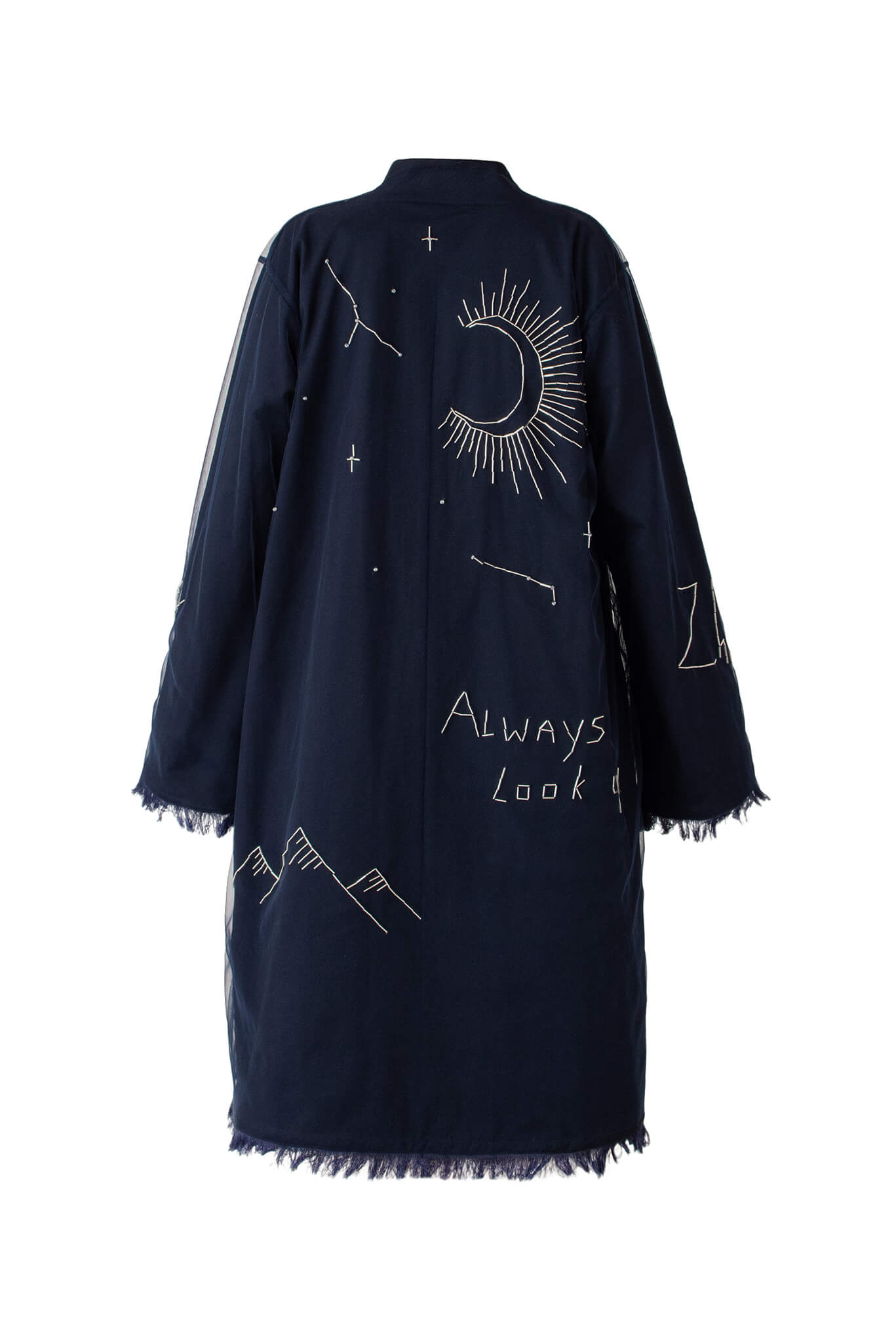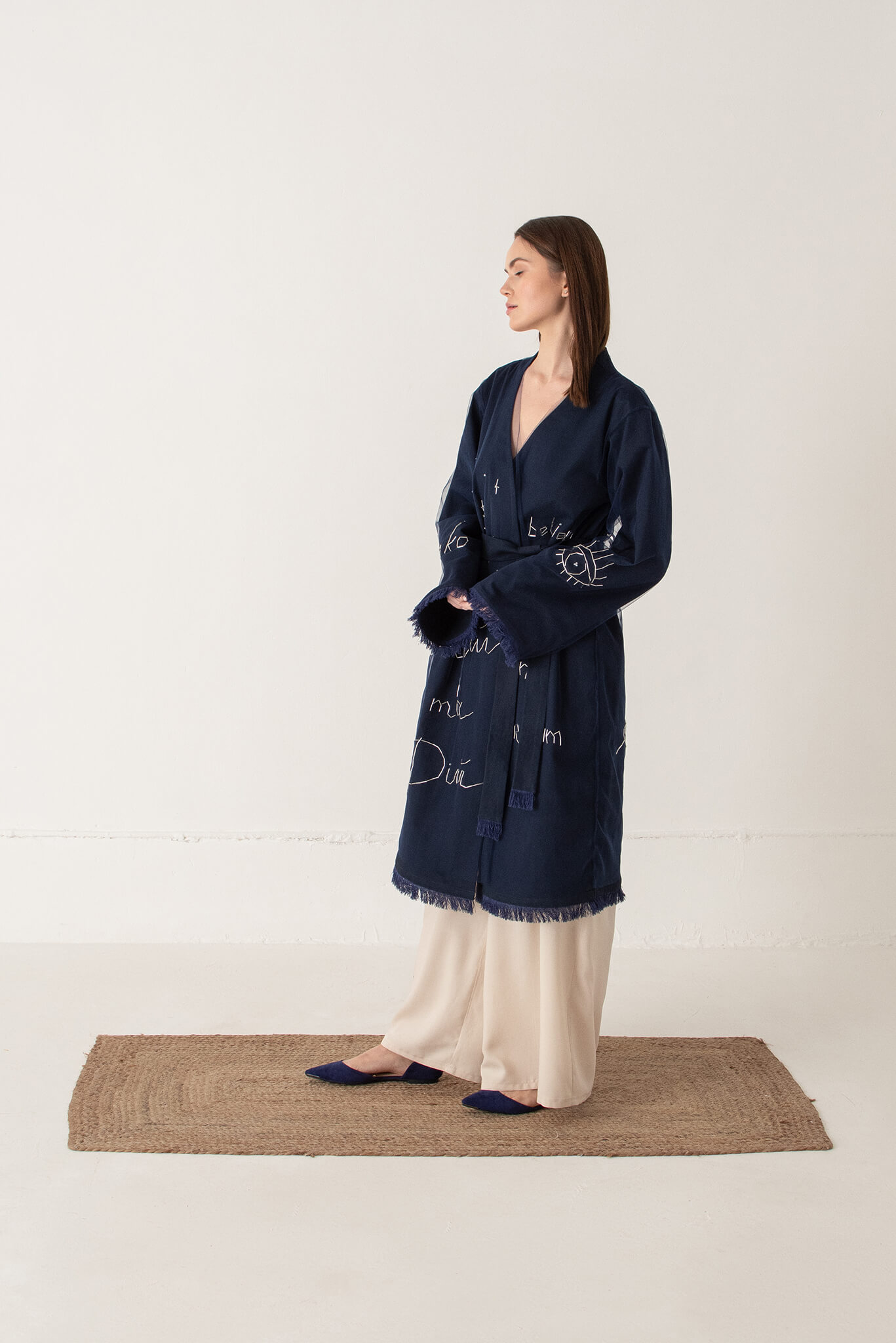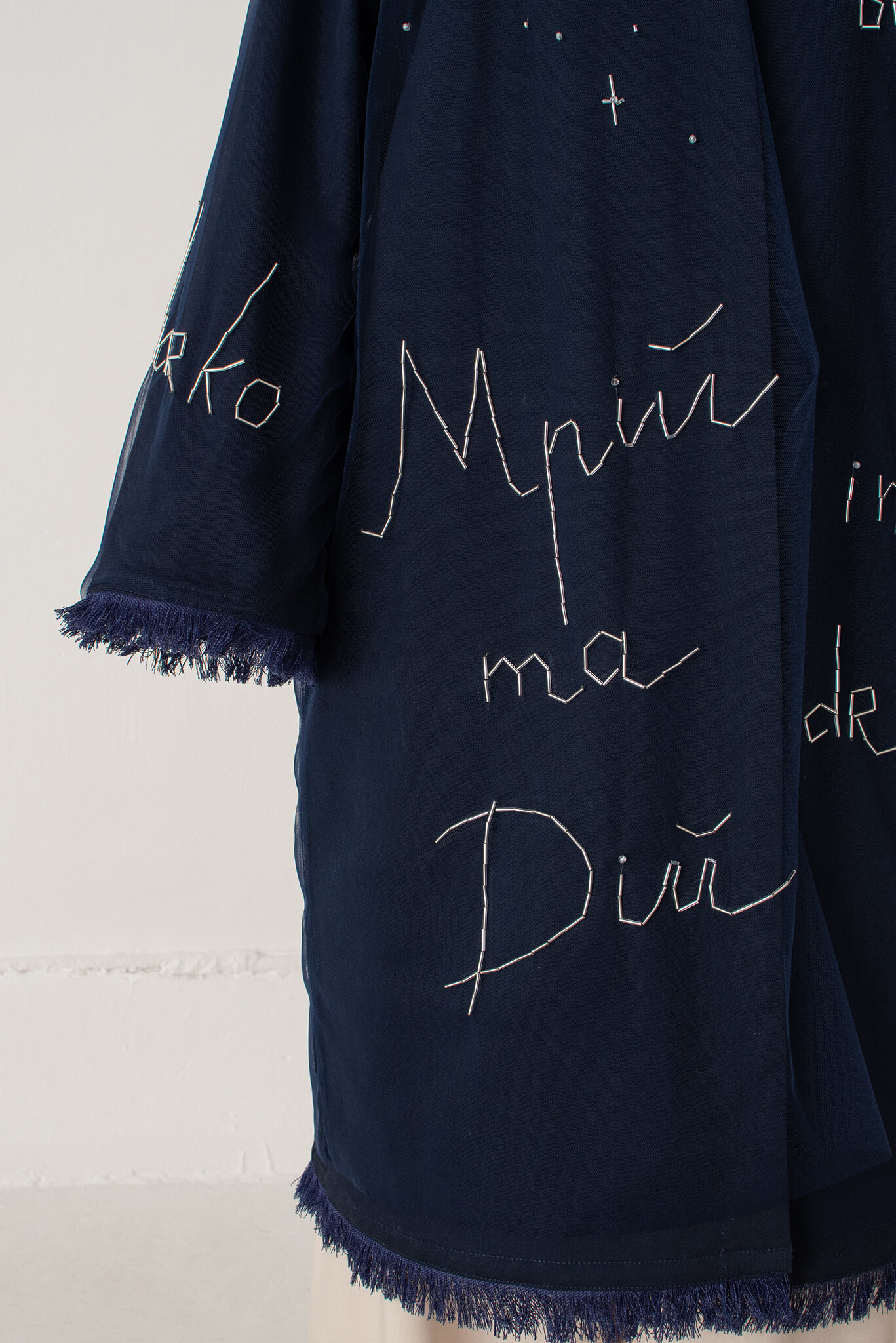 Кімоно з ручною вишивкою. Кімоно вільного крою з довгим широким рукавом, складається з двох частин: саме кимоно та накидка з фатину з ручною вишивкою бісером. Можна носити окремо. Рукава і низ кимоно прикрашені бахромою.