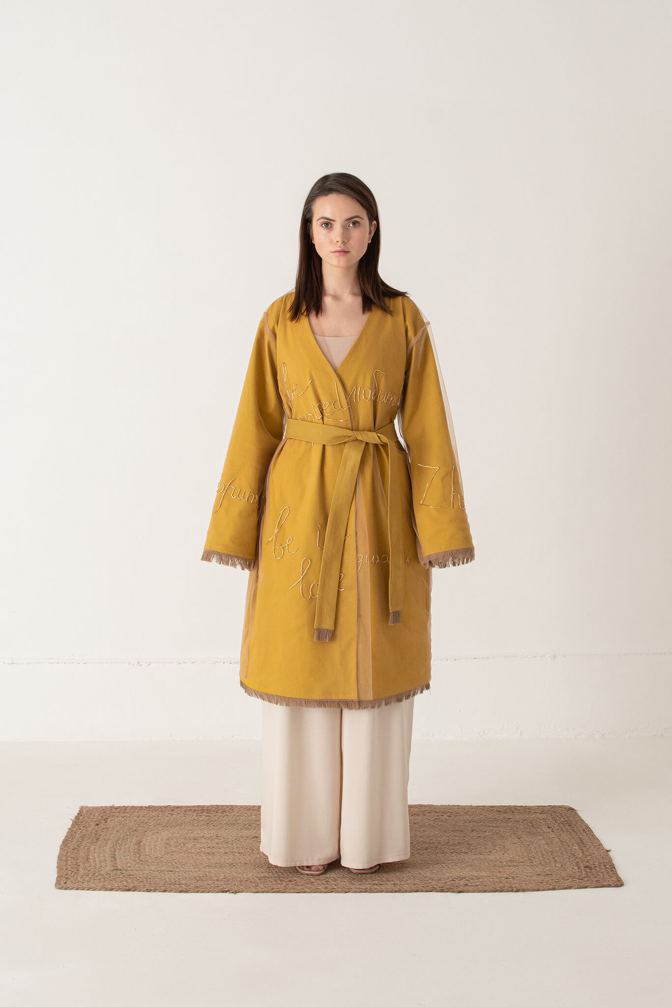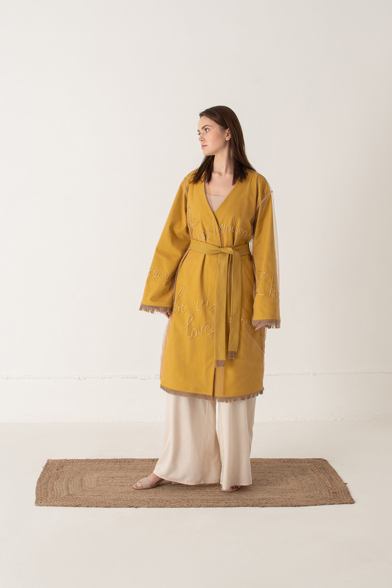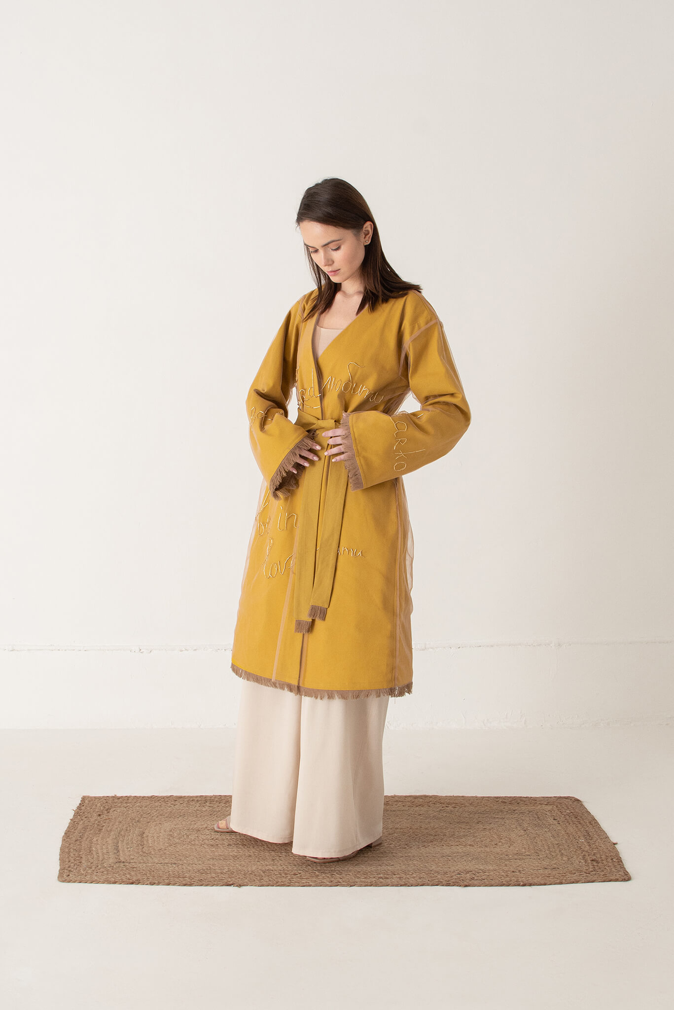 Доставка впродовж 2-5 робочих днівКімоно з ручною вишивкою. Кімоно вільного крою з довгим широким рукавом, складається з двох частин: самого кімоно та накидки з фатину з ручною вишивкою бісером. Ці деталі можна носити окремо. Рукава та низ кімоно прикрашені бахромою.