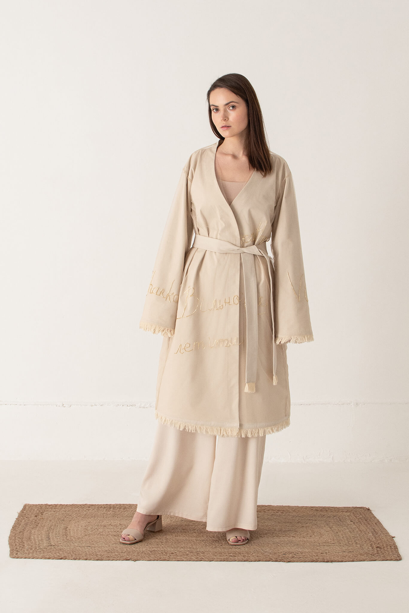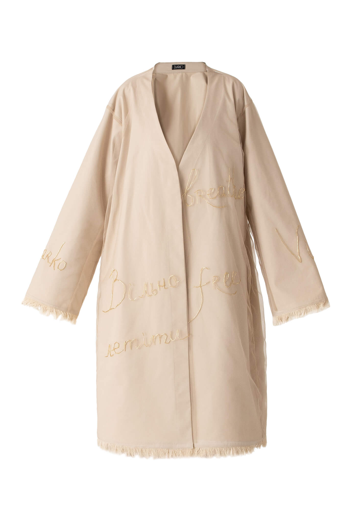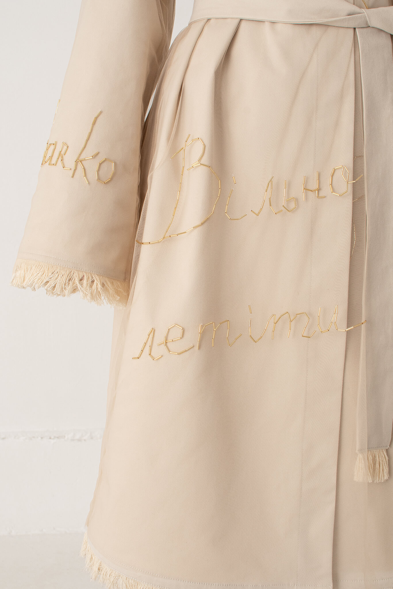 Доставка впродовж 2-5 робочих днівКімоно з ручною вишивкою. Кімоно вільного крою з довгим широким рукавом складається з двох частин: саме кимоно та накидка з фатину з ручною вишивкою бісером. Обидві частини можна носити окремо. Рукава та низ кимоно прикрашені бахромою.