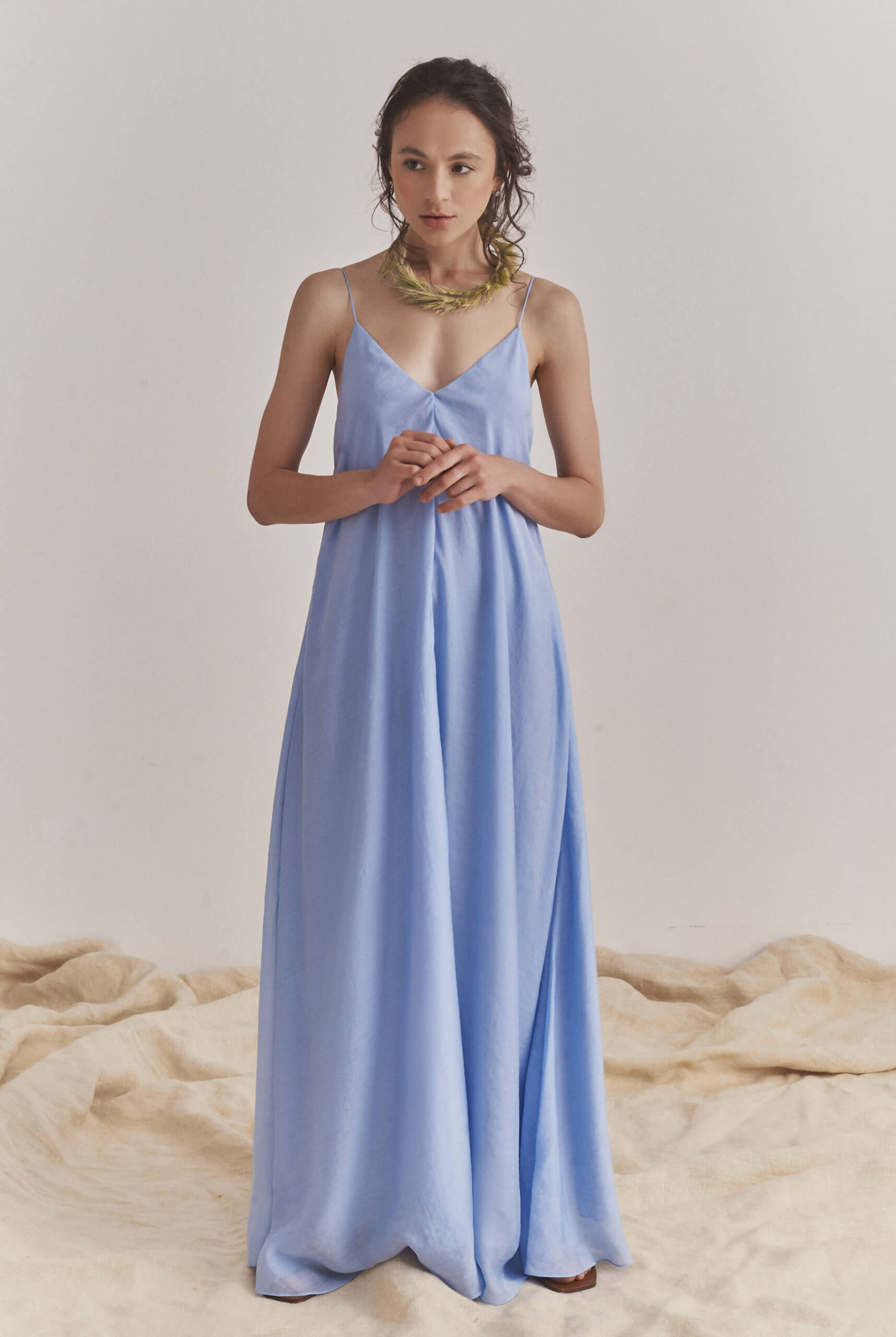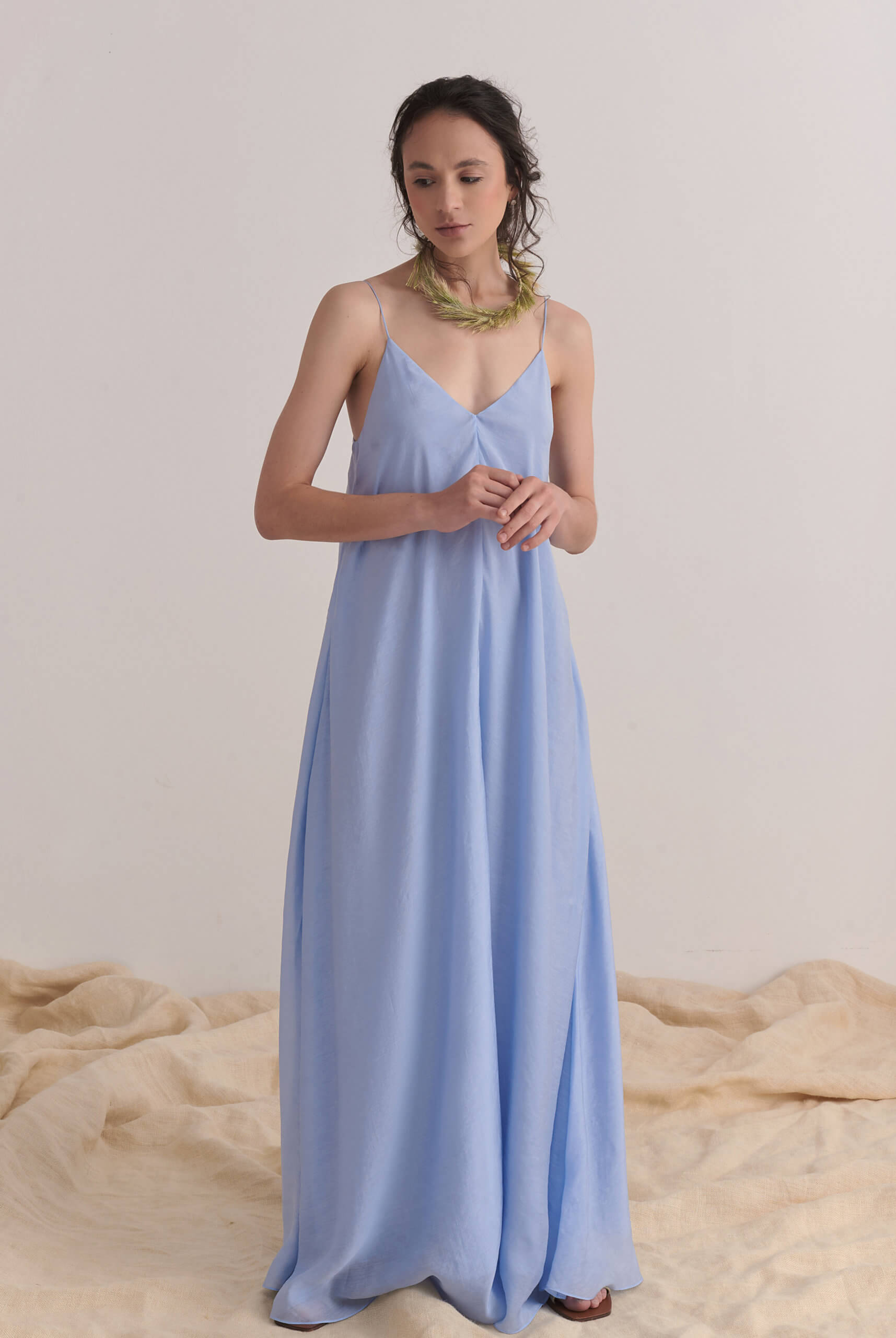 Сукня складається з двох шарів легкої, струмливої тканини. Довжина сукні — максимальна.