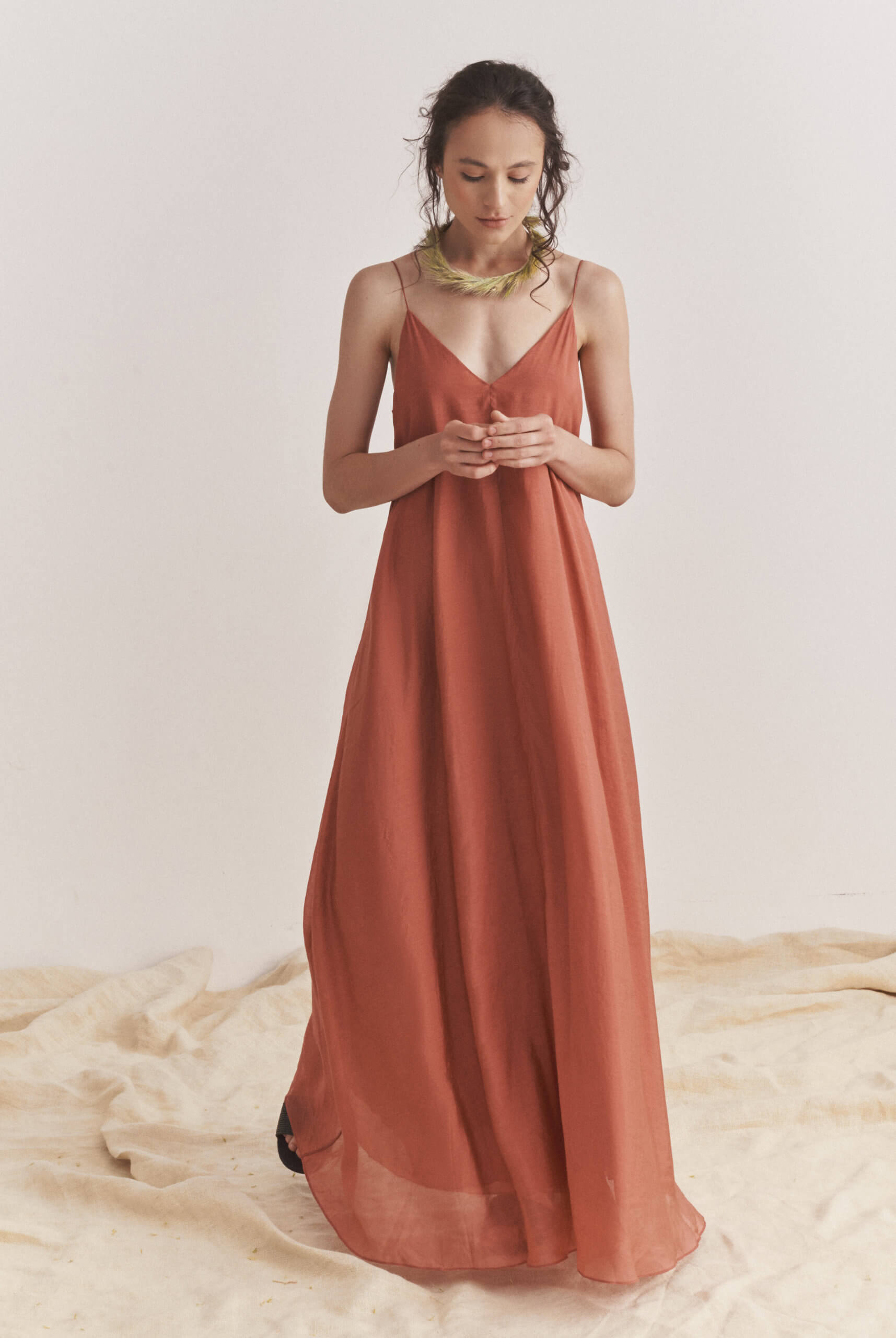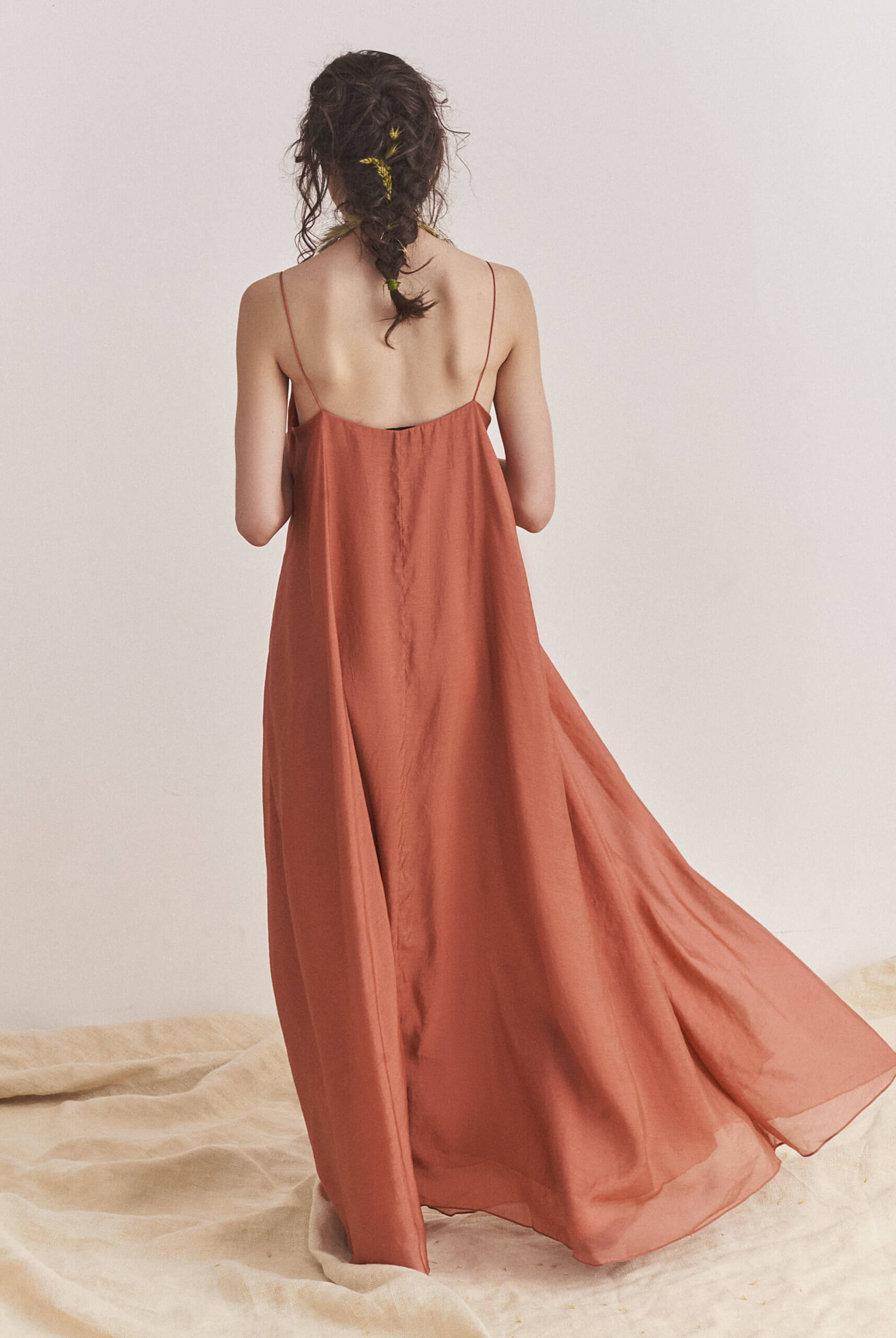 Сукня складається з двох шарів легкої, струмуючої тканини. Довжина сукні максимальна.