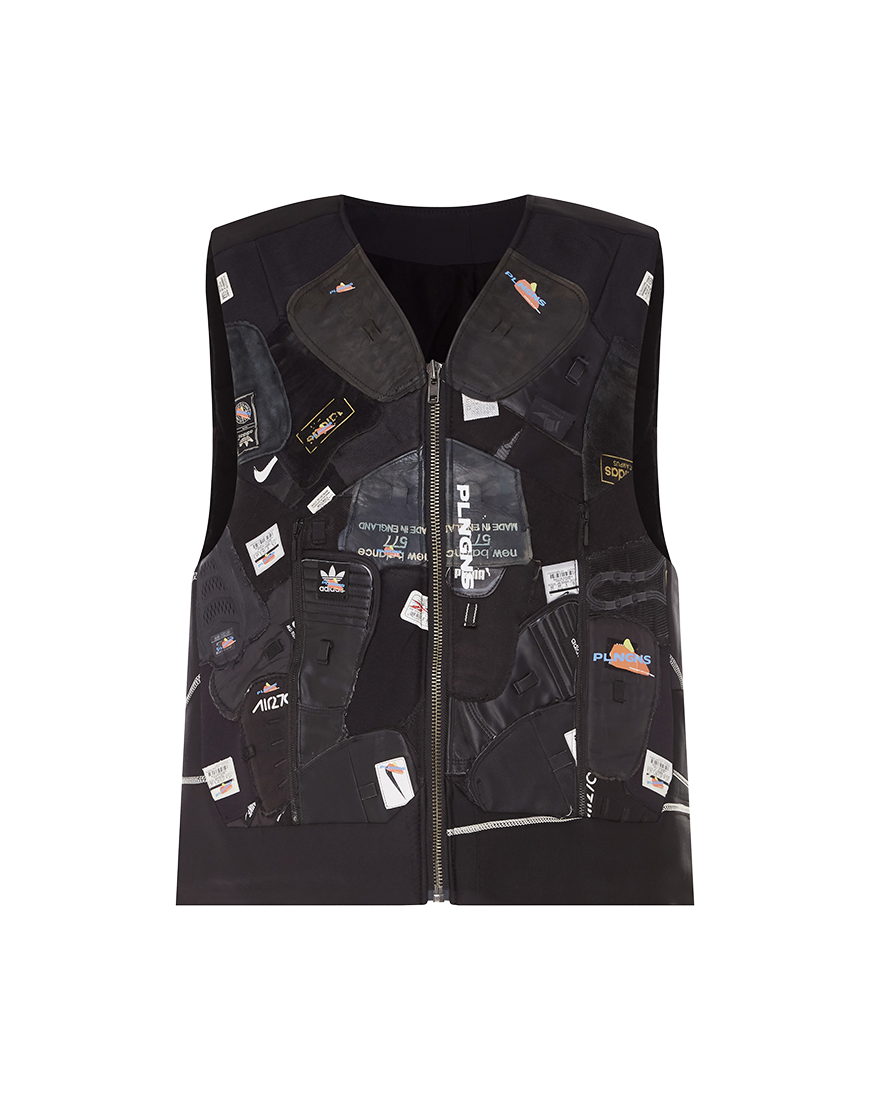 Унікальний унісекс жилет, повністю виготовлений з кромок і язичків кросівок. Ця легендарна жилетка брала участь у першому показі PLNGNS в рамках Berlin Fashion Week взимку 2024 року та входила до колекції “Ain’t it different”. Кожна панель розповідає історію про переродження взуттєвих відходів у витвір мистецтва – складні шви, текстури кромок, оригінальні лейбли брендів.